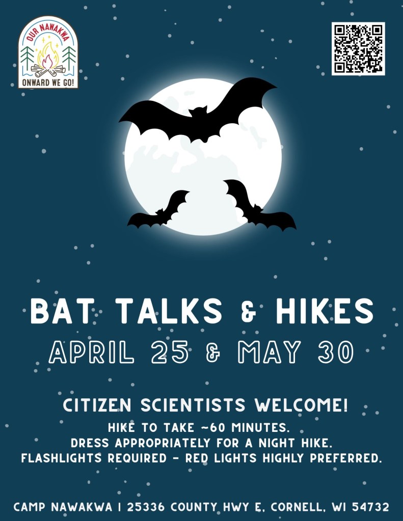Join us for an evening of bats, science, and night hiking at Camp Nawakwa! We’ll begin with a short bat talk, gather by the bat houses at sunset, and then head out on a guided bat monitoring hike around the lake.